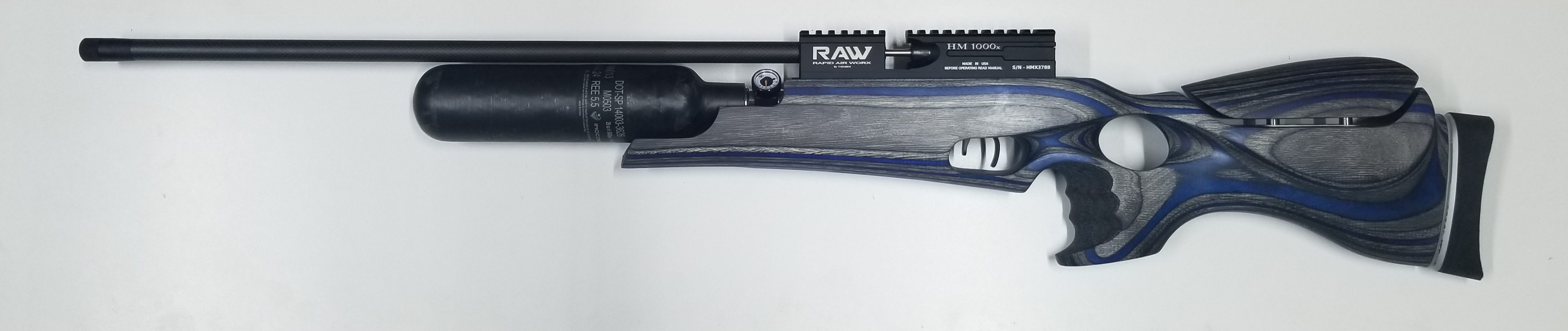 Airguns USA custom Thumbhole stock in Black,Blue, fitted with UIT rail, adjustable cheek and pad.