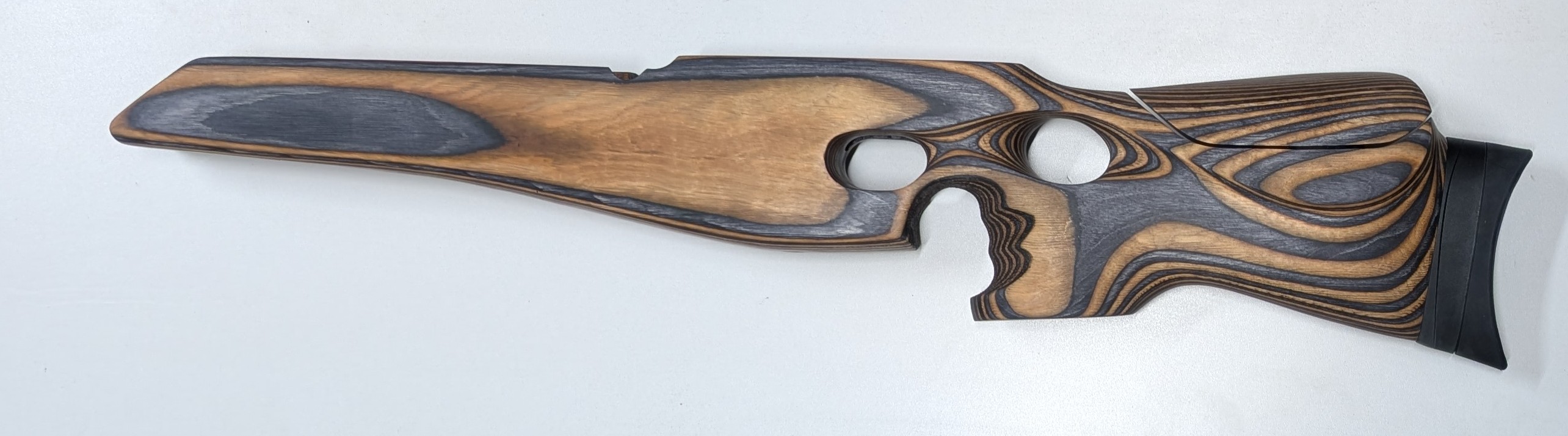 Right Hand laminate thumbhole Deep Belly stock to fit TM, BM, HM and Theoben MK2 style actions with slim cylinder, UIT rail fitted to front, adjustable cheek mechanism and Aluminum adjustable recoil pad.
