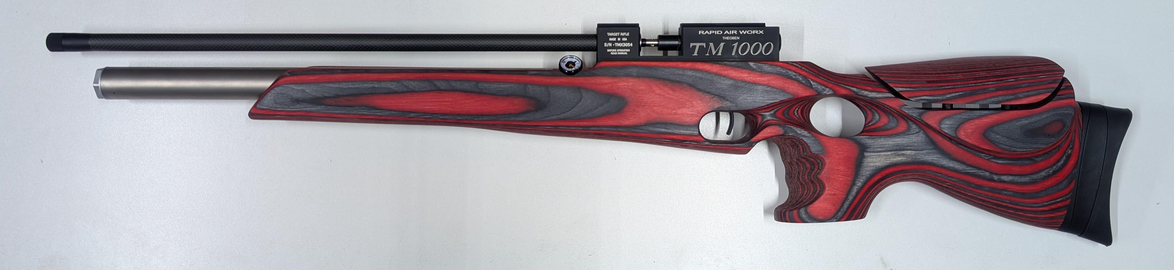 Airguns USA custom Thumbhole stock in Red/Black, fitted with UIT rail, adjustable cheek and pad.